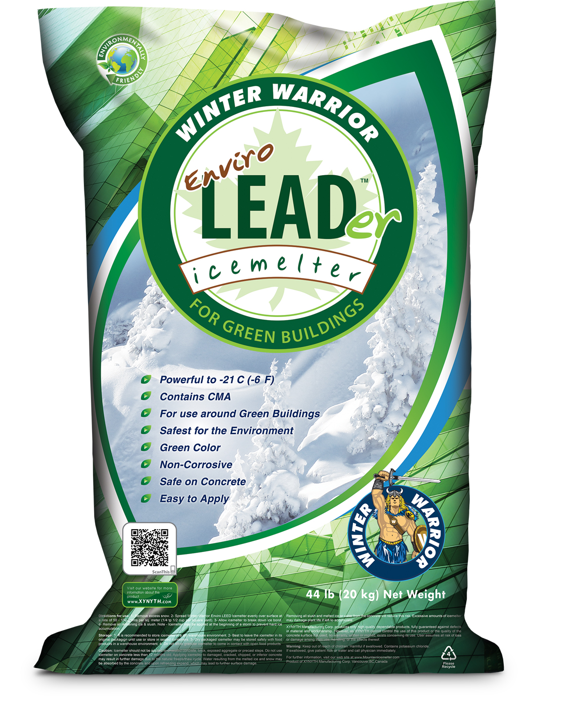 Winter Warrior Enviro LEADer Icemelter ™ does NOT contain any salts, chlorides, nitrogen or triazoles. It is a viable economical Green sustainable option for melting the ice, around Green eco-buildings.